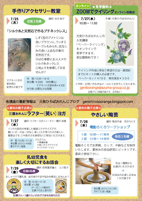 2022年7月イベント情報 投稿者 元気ひろばおれんじ 日付: 7月 05, 2022 リンクを取得 Facebook × Pinterest メール 他のアプリ 2022年7月のイベント情報をご案内します。気になる講座がございましたら お気軽にお問合せください。※緊急事態宣言が発令された場合、臨時休業となる場合がございますので ご了承願います。お問合せ・お申し込み元気ひろば おれんじ10時~16時半0422-76-5940 コメント